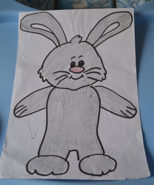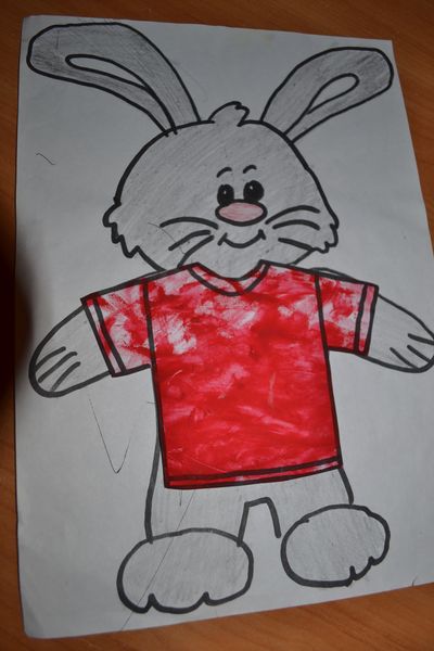 6. Футболку я вырезала, и мы одевали в нее зайчика. Ее рукой мазала клей и накладывала на зайчика, она торжественно прихлопнула.