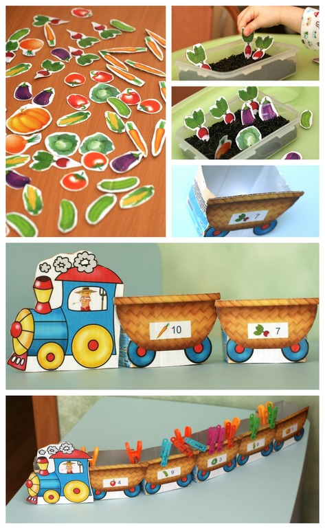 Математическое развитие (арифметика, геометрия, величины, временные и пространственные представленияНаша новая самодельная игра "Веселый фермер". Сначала мы сажаем овощи. А потом собираем урожай, и поезд отвозит его на базар. Вообще-то поезд рассчитан на детишек постарше и развивает математическое мышление. На каждом вагоне указано, какой овощ туда надо положить и сколько штук. Мы пока только сортируем. Я считаю за Илюшу, и показываю ему цифры на вагонах. Картинки скачаны в интернете, наклеены на картон. Овощи ламинировала скотчем. Вагончики наклеила на коробки из-под молока "Тёма".