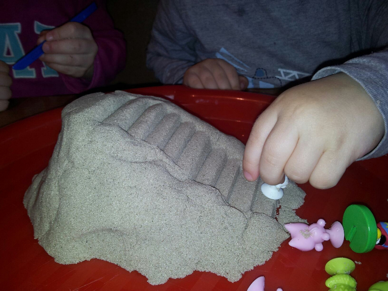 Все о развивающих игрушках, пособиях и книгах (обзоры, рекомендации,хвастики, ссылки)на 3 года моя сестра нам подарила 2 кг кинетического песка. покупали на сайте Скажу вам это вещь! то что он не обычный и течет и лепится это мы на видео смотрели. Интересно было как детям он придется "по вкусу". И на сколько долго его хватит. Так вот - как вспоминают сразу просят. Играют долго. Почти без моего участия. Стараюсь показать какие-то приемы, что видела и что приходит в голову. Что-то придумывают сами. Что успела засняла, так что дальше наш фото отчет