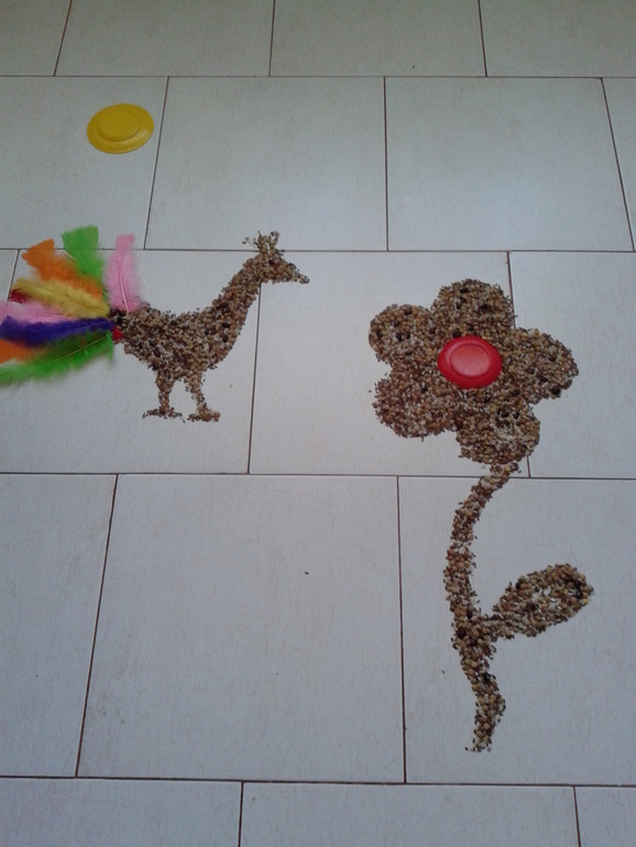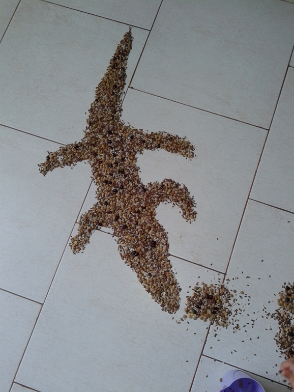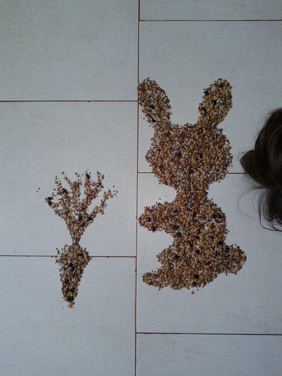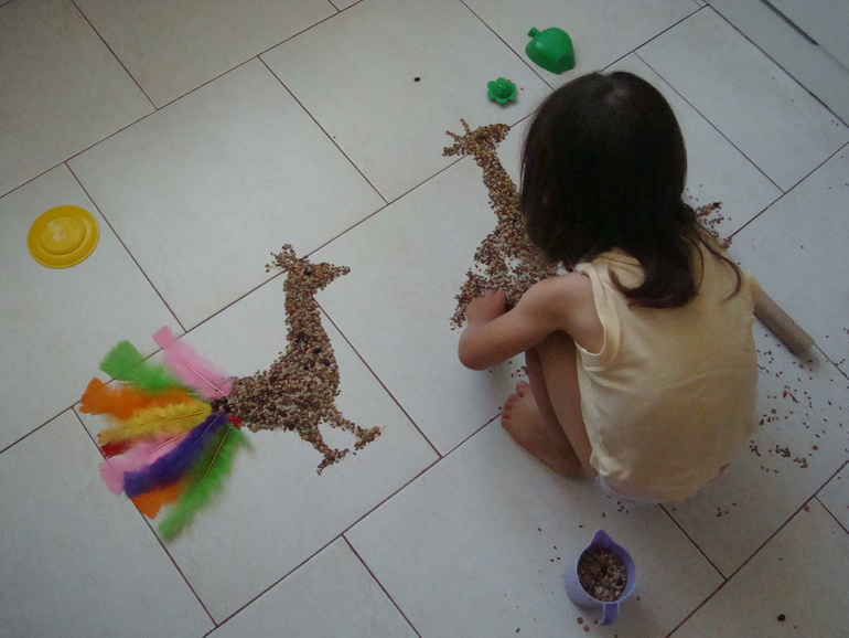 Все фигуры делала конечно же я, а дочка между делом смотрела и оценивала результат, и наводила хаос. Мне самой очень понравилось, вот что значит экспромт! Обязательно будем продолжать заниматься в том же духе. Если же кто-то ещё не понял причем тут фантазия, объясняю, что ребенку важно показать что из обычных вещей (предметов) можно сделать что-то необычное (в данном случае из материала для пересыпания получились фигуры "животных" и ещё мы обыграли для каждого животного-птицы-пчелы небольшие сюжеты).