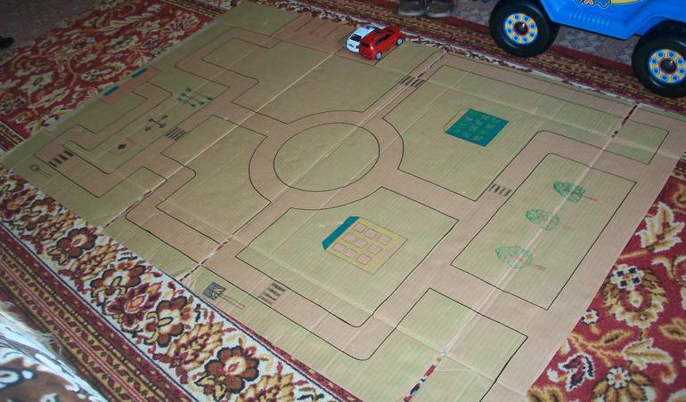 Развитие детей третьего года жизниУже давно хотела я купить для сына коврик с дорожками, да вот так и не купила. Потом в интернете увидела вариант распечатать картинку с дорогами на листах А4 и соединить в один большой "коврик". И тут под руки попалась большая картонная коробка. Наконец-то все идеи собрались воедино - я решила нарисовать всё сама. И вот, что из этого вышло: