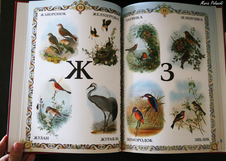 И Азбука Птицы. (В Лабиринте, , ) Но это все-таки скорее не азбука, а книжка с картинками птиц. Я бы назвала ее энциклопедией, но увы о каждой птице кроме названия ничего нет. Как книжка для знакомства с птицами для малышей - идеальна, как азбука сомнительно. Буквы не очень крупные, черные и больше внимания у детей привлекают птицы, чем к буквам. Я в основном покупала книгу именно ради знакомства с птицами, так что о покупке не жалею, хотя было бы лучше, чтобы хоть что-то о них написали бы.