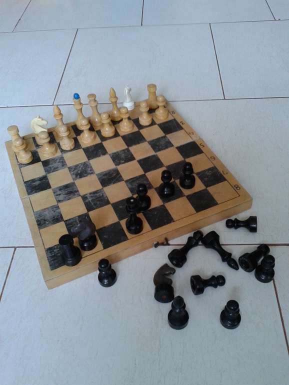 папины старые-престарые шахматы. Папа что-то там пытался про правила объяснять, но только из названий она запомнила короля и королеву и офицера, а в основном расставляет их по шахматной доске.