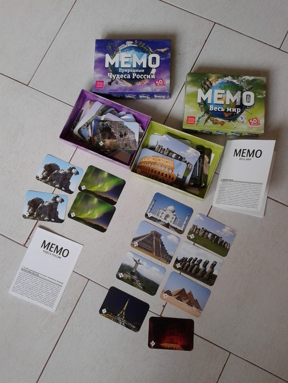 по ним хорошо изучать достопримечательности (и с ними играть, картинки по размеру с детскую ладонь). Некоторые картинки вызывают недоумение, почему Эйфелева башня и Петра показаны в ночное время, какой смысл? Плюс этих игр - их не жалко давать деткам в руки (как, например, дорогие книги). Надеюсь картинки доживут до Сониных 5+ особенно это касается "Чудес России", так как картинки там трудноразличимы.
