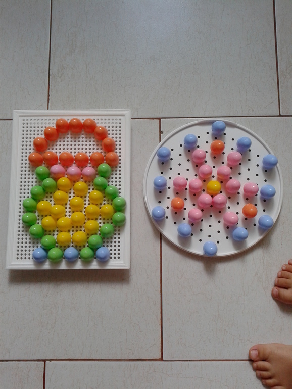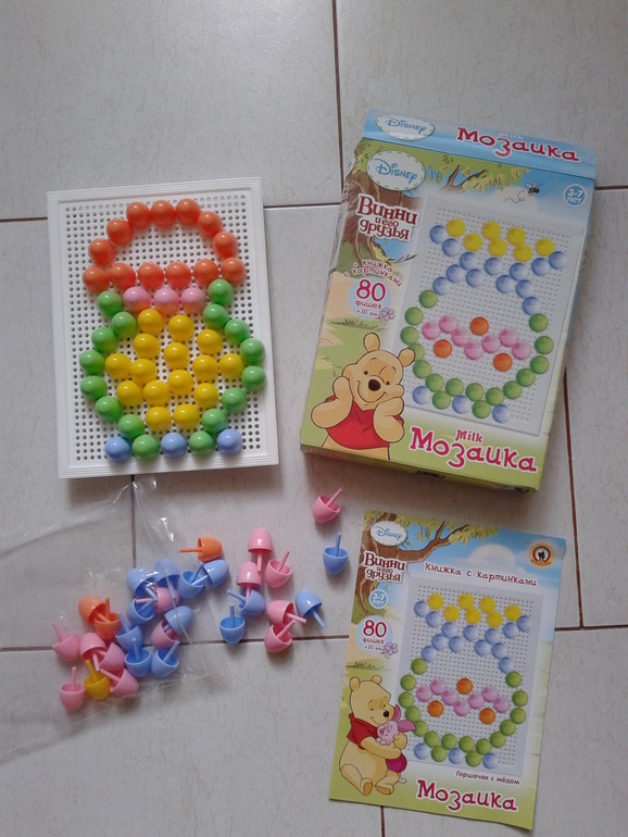 У этой мозаики очень понравились пастельные цвета деталек, но есть трудности с втыканием (так и игра на возраст 3+). А вторая обычная от Стеллар, купленная что называется не глядя, с обычными фишечками. Мы попробовали испечь пирог на стелларовской круглой основе: