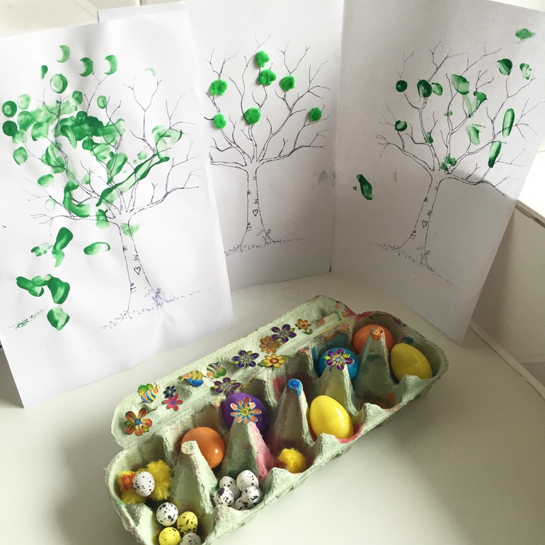 Встречали весну - рисовали зеленые листья на деревьях пальчиками, пластилиновыми шариками и ватными палочками. Вместе сделали сенсорную пасхальную коробочку - раскрасили коробку от яиц, украсили наклейками, заселили яйцами и цыплятами