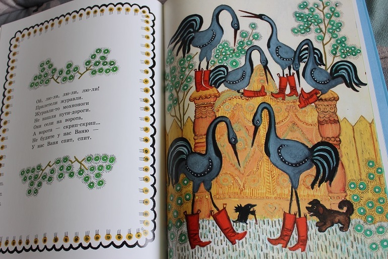 При всем многообразии народных потешек, представленных в нашей библиотеке, в этой книге нашлись те, о которых я и не слышала. А еще тут есть несколько традиционных колыбельных, про журавлей, про волчка, про зайчика… Сопровождаются они, естественно, иллюстрациями на всю страницу.