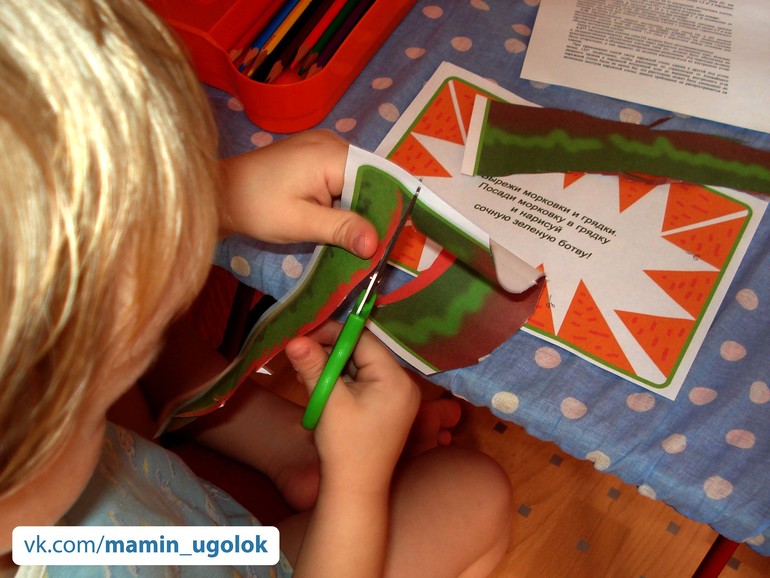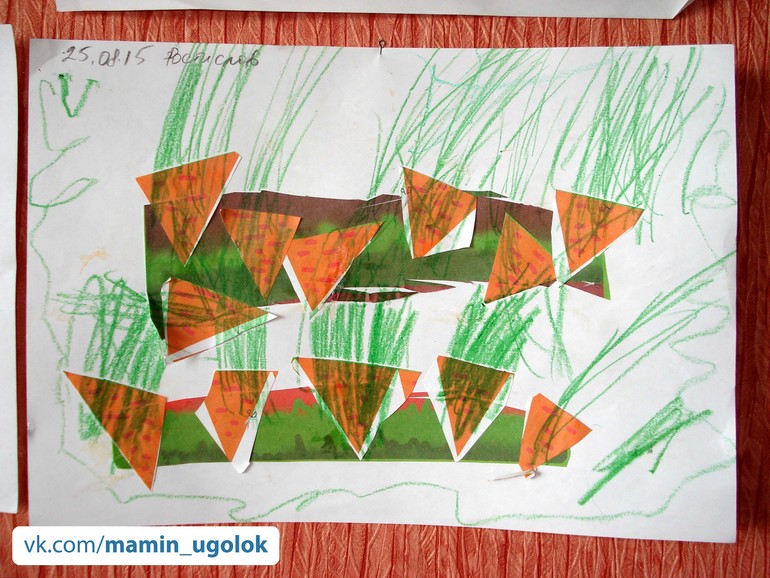 Учились работать ножницами, вырезали морковку, приклеили и нарисовали сочную ботву)))