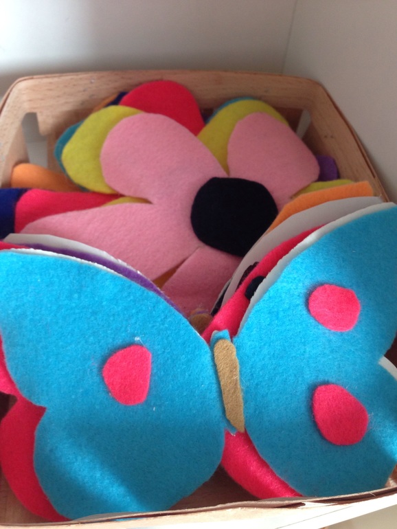 7. Самодельная фетровая игра, в ней нужно по цвету подобрать по цвету бабочку на цветочек. К тому же на каждом крылышке есть точечки, их моджно посчитать и заглянуть под крыло, там нарисована цифра. Подробно уже писала об этой игре в дневнике.