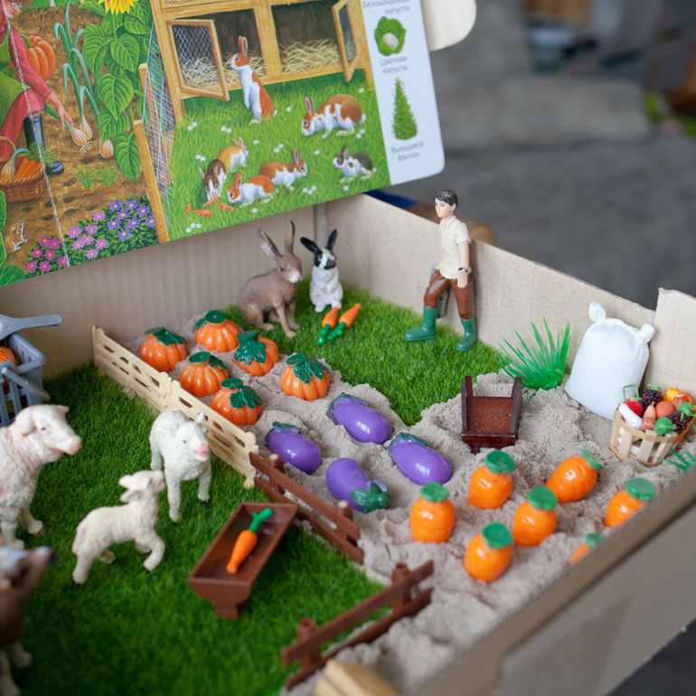 Наполнение: декоративная трава, кинетический песок, фигурки schleich, Safari, фрукты и овощи с алиэкспресс.