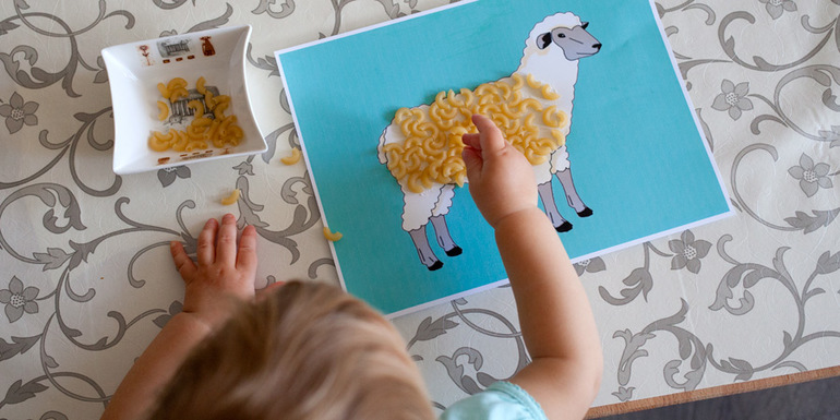 И еще одна аппликация с макарошками, клеили их в качестве завитушек у овечки.