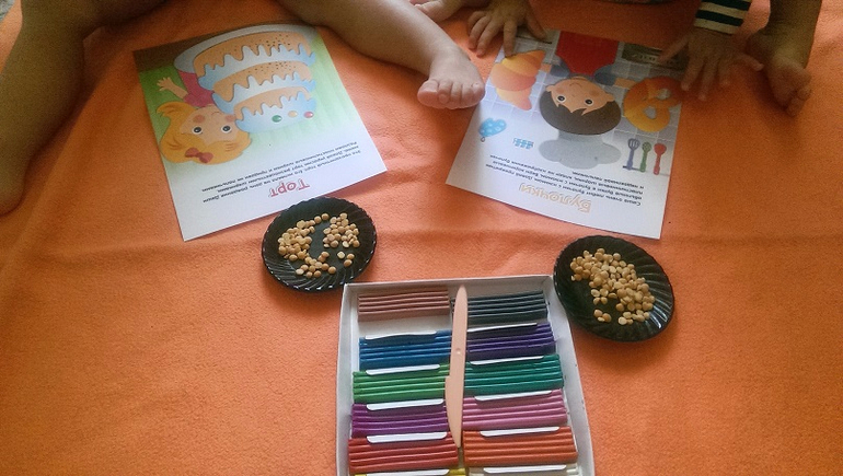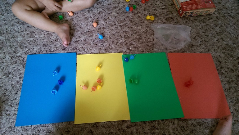Базовых 4 цвета выучили давно и дети любят сортировать по цветам. Сортируем что под руку попадает: детали конструктора, мозаика, кубики, шарики и др. Ввела розовый и оранжевый, легко справились, буду дальше добавлять.