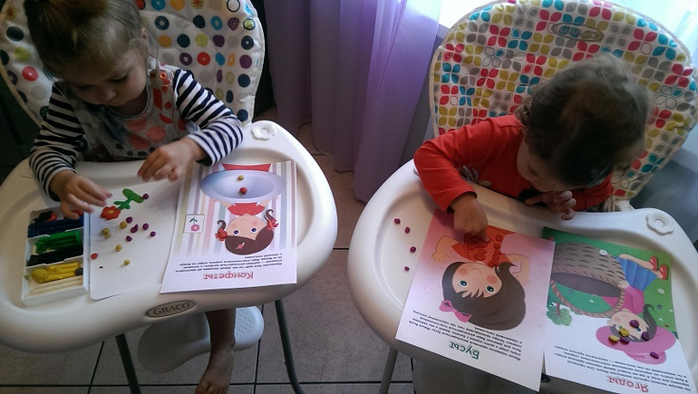 Про рисование, там 2 листа образец и лист для непосредственного рисования. Сначала пальчиками рисуют, стараются повторить, за границы не выходят. Если баловаться начинают и все размазывать, это обычно если уже надоело и хочется чего-то новенького, я выдаю кисточку. Пусть раскрашивают как обычную раскраску.