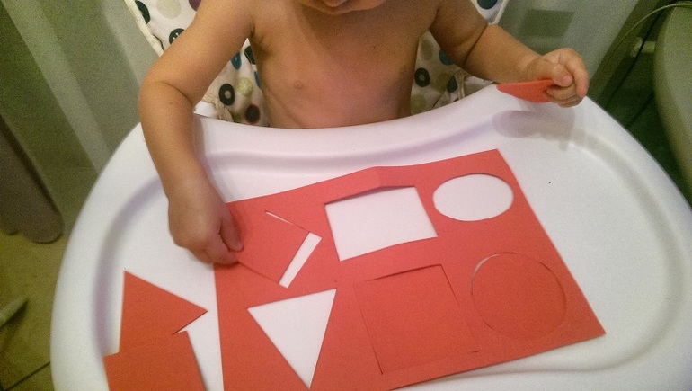 Там образом отрабатывали и понятие большой-маленький. Беги в большой круг, потом в маленький квадрат, большой треугольник и т.д. Есть у нас деревянный сортер, деревянная рамка-вкладыш с фигурами, еще сама сделала из декоративной пенки, просто вырезала фигуры канцелярским ножом, эту игру любят больше деревянной.