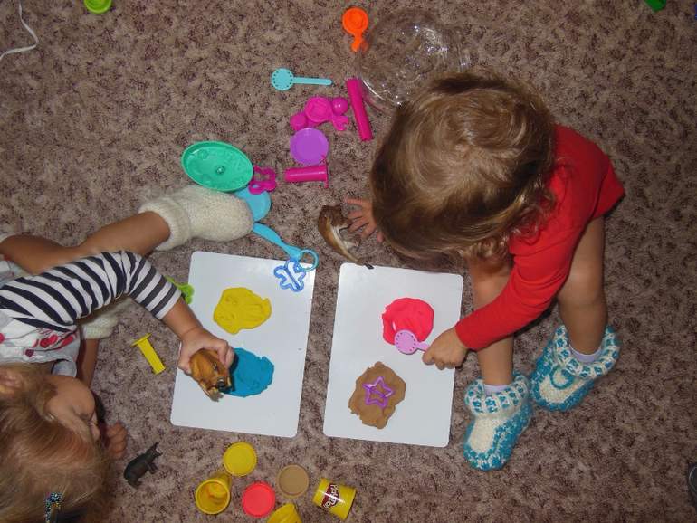 Лепят как пластилином, так и тестом Play-Doh. Вот недавно играли, одевали животных в шубы, дети раздевали и сортировали "шубки" по цветам в баночки.Конечно всех покормили и спать уложили.![]()