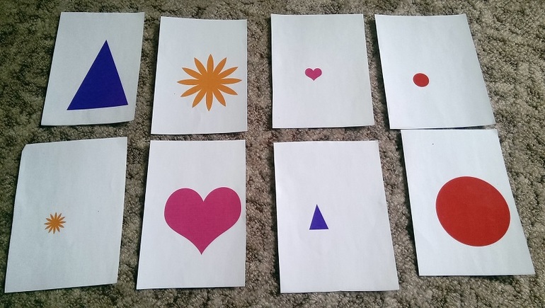 Раскладываю карточки с разными фигурами и размерами и прошу показать где маленький круг, где большой треугольник и .т.д.