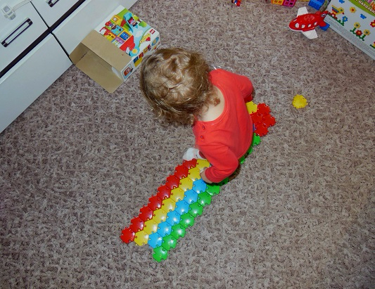 Напольная мозаика которая ранее просто расбрасывалась, теперь строятся дорожки, простейшие фигуры. Вот с маминой помощью построили целый автобан по которому можно побегать, а потом с радостью разломать.