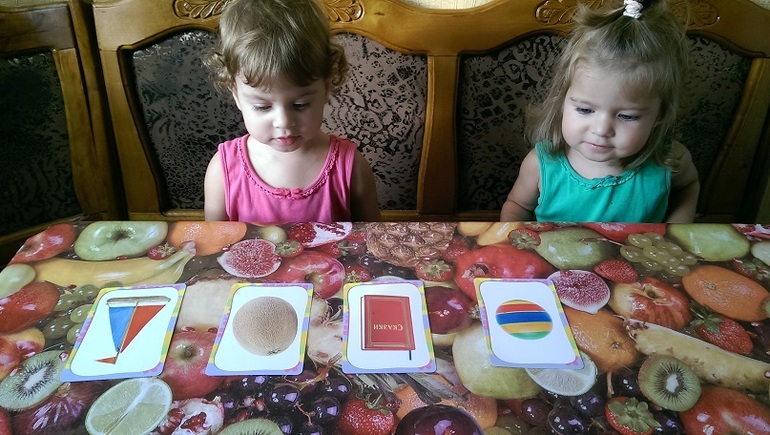 Сетка памяти. Беру несколько карточек раскладываю перед ребенком, называю что изображено, прошу запомнить и переворачиваю карточки. Потом прошу показать мне например дыня, если правильно переворачиваю карточку и дальше задаю вопрос, пока не откроем все карточки. Начинали мы с 2 карточек и быстро перешли на 3, потом 4 и сейчас топчемся на 5, но без ошибок. Сложность еще в том что детей двое. Они могут отвлекаться, т.к. задание делаем по очереди, или одна спешит помочь другой. Если детей рассаживаю по своим кроваткам, то в одиночку результаты намного лучше, иногда и 6 карточек могут осилить с 1 ошибкой.