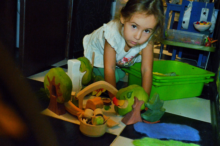 Вот и самостоятельно хозяйничает в своей коробке с лесом, домиком, печкой, посудкой.