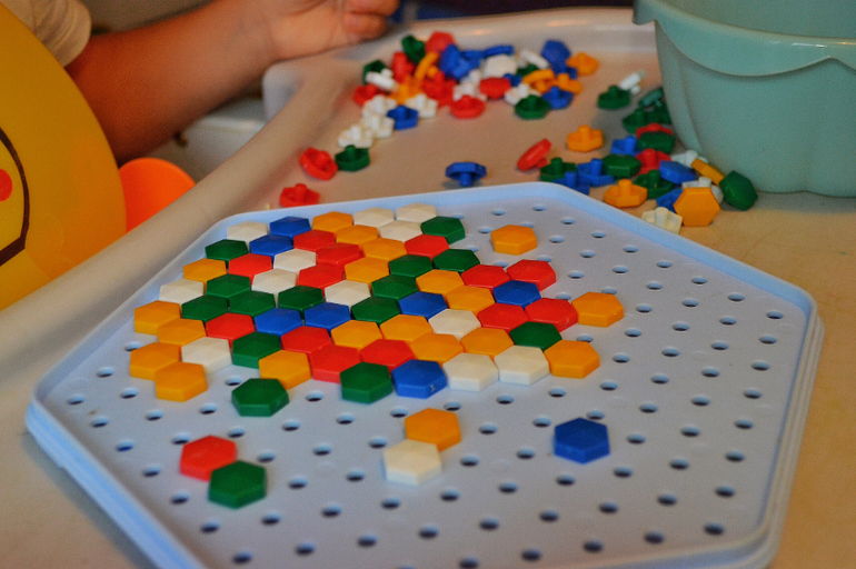 Мозаик у нас 2 . Самые обычные. Никаких цветочков не делаем. Даша просто выкладывает какие- то свои узоры и рассказывает мне истории по ним))