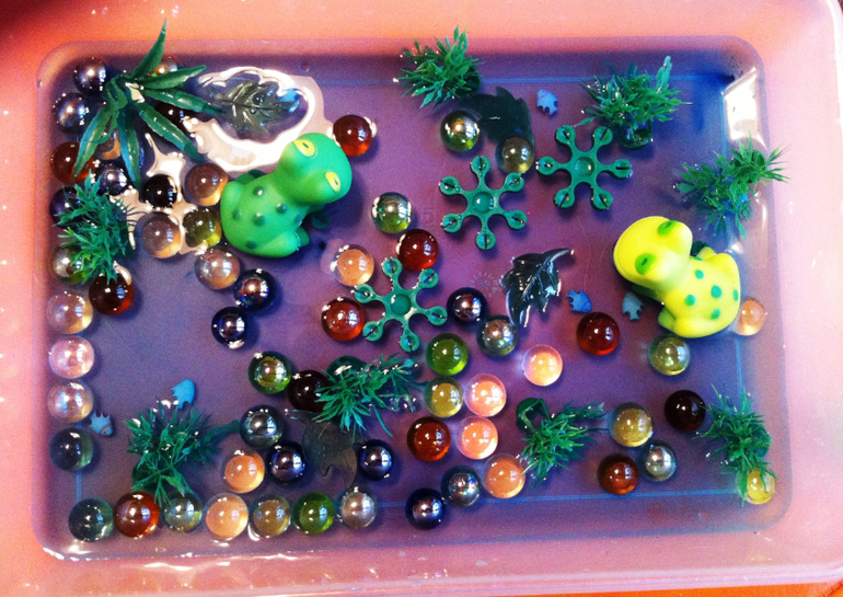 Мы играли в Ассоциации "Зверята" и "Лягушачий балансир" от Djeco. Вот лягушки из этих игр и перекочевали в наш самодельный пруд: