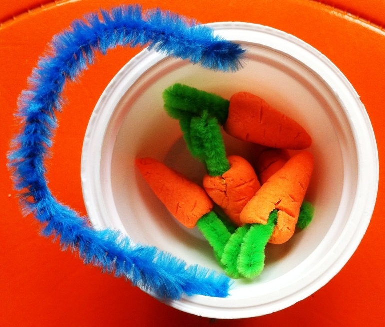Благо есть маленькие грабли, лопатка и лейка и что сажать: мама готовила для другой игры овощи (морковь, редис и свеклу) из пластилина и синельной проволоки, но почему бы и нет.