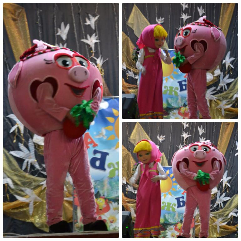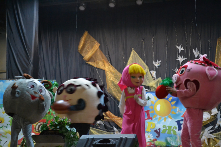 По ходу представления смешарики предложили Машу тоже надуть. Всех деток попросили подуть на Машу, чтобы она стала такой же круглой как смешарики.
