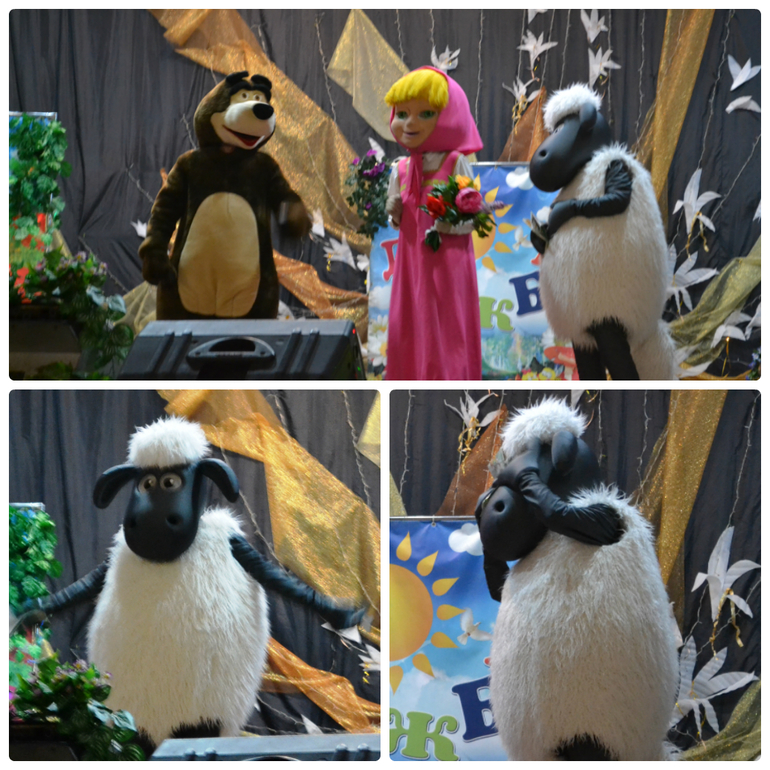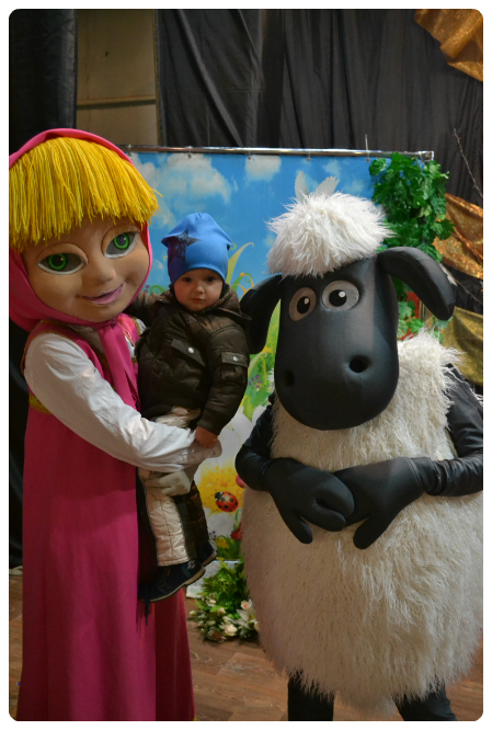 В конце спектакля на зрителей полился дождь из мыльных пузырей, детки очень обрадовались стали их ловить. В конце выступления была возможность сфотографироваться с Машей и Баранчиком Шоном, мы ей с Даней и воспользовались.