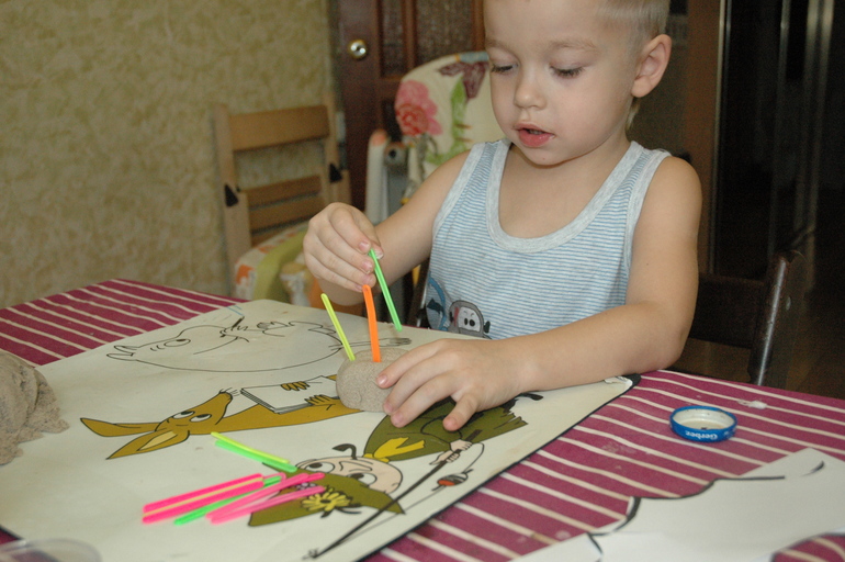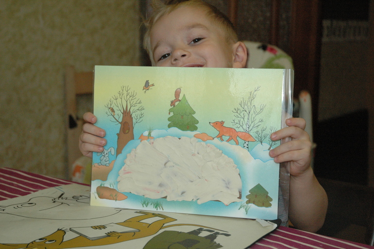 Поработали с пластилином, лепили шарик, приклеивали и размазывали пальчиком.