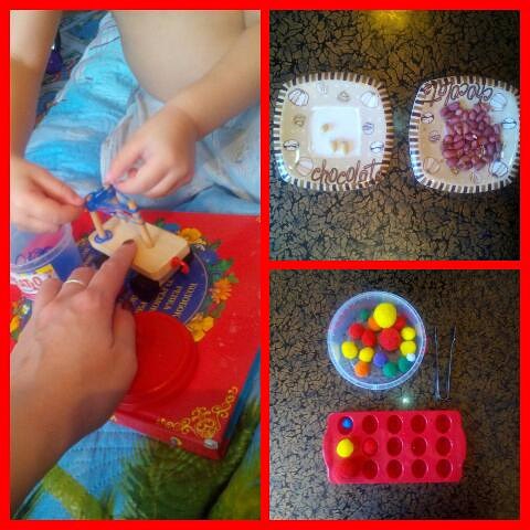 Сегодня я упала! Натягивает Иван резиночку, тут она срывается, а он "воть хрень какая!" Даже сказать было нечего в ответ, папа смеялся, а я сидела открыв рот... Это было задача для пальчиов. Плюс к этому жареный арахис пошелушили. И помпоны сортировали маленький-средний-большой.