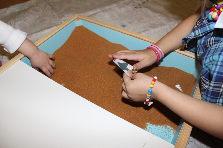Простое задание для Вари - найди тень, поэтому для разнообразия тени были зарыты в песке (Варе понравилась эта тема)). К слову сказать, Катюшку тоже допустила к этому песку (впервые), ей было любопытно, ладошками возила по песочку, поднимала кулачок, высыпая песочек, а потом хотела с ногами внутрь залезть, много раз порывалась и была недовольна, что не пускают.