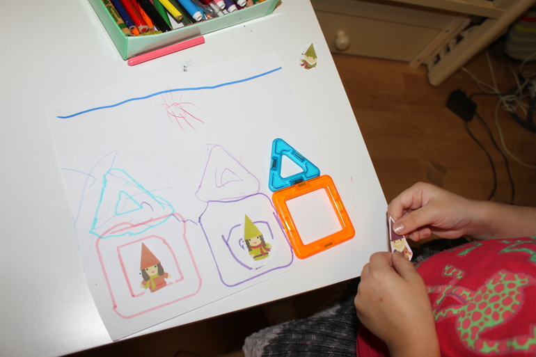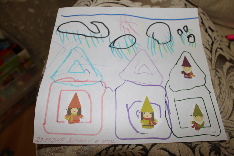 Ещё новенькое Вареньке предложила - нарисовать гномикам домики, обведя детали магформерс. А когда она расселила гномиков, попросила её рассказать мне сказку. Надо почаще это делать. Варенька по ходу рассказа дорисовала тучи и дождик.