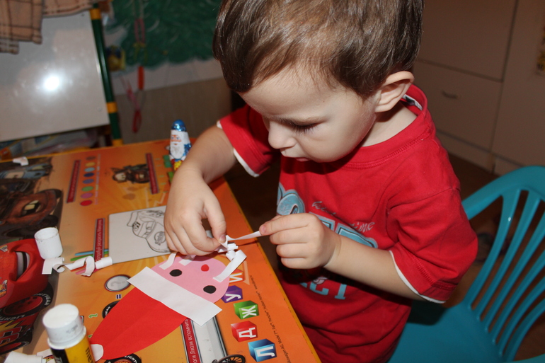 Следующим их ждала аппликация, делали Дедушку Мороза с Бородой. (Склеивали готовые детали).
