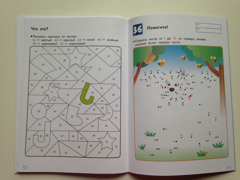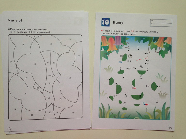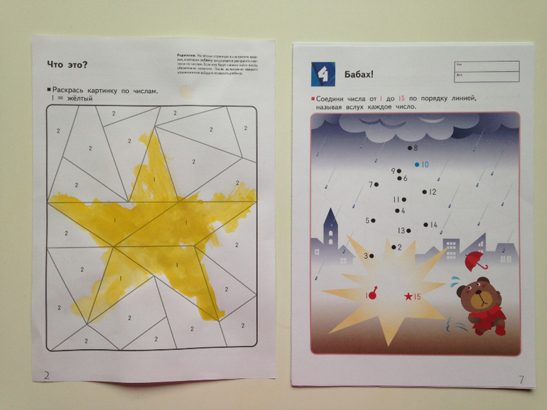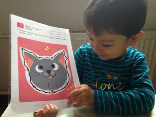 Отличная книжка, хоть нам больше по силам пока одна ее часть: та, что вы видите слева. Мне пока такие задания не встречались, Диме, соответственно, тоже. Поэтому пошли на ура. Нужно раскрасить определенным цветом кусочки с конкретной цифрой, в итоге получится какой-то рисунок.