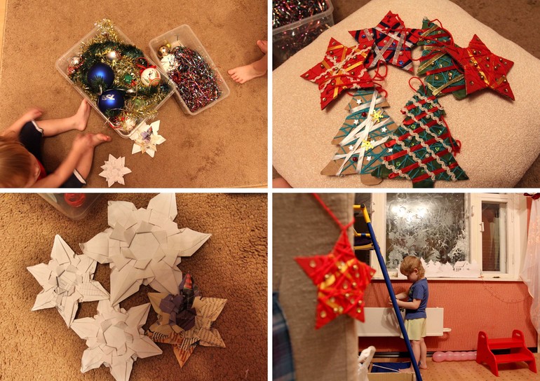 Первое, собранное на скорую руку: коробка с елочными игрушками и старым запутанным дождиком. С игрушками весло бегать по квартире и даже украшать. А в дождике можно прятать игрушки и запутывать пальчики.