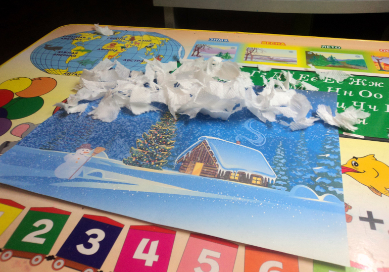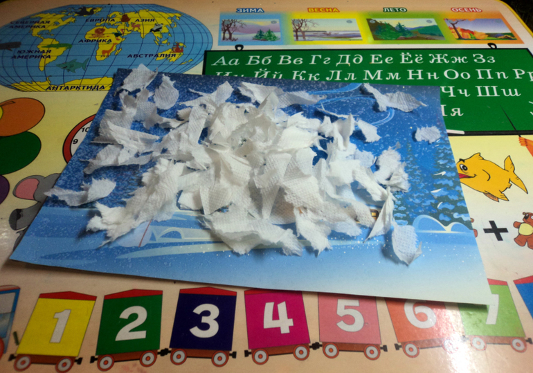 Иногда мы просто делаем несколько глубоких вдохов и выдохов. Но так как дыхательные игры нравятся моей дочке, я стараюсь все же включать их, чтобы доставить ей больше удовольствия от занятия. На данном занятии мы сдували клочки салфетки с картинки, как будто это снегом все занесло; сдуваем и смотрим, что под снегом скрывалось.