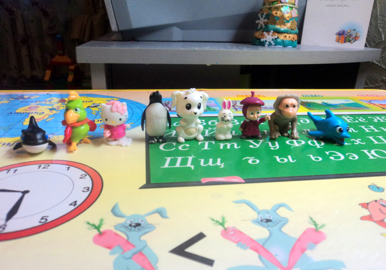 Игра 1. Разложила перед ребенком 10 маленьких фигурок. Попросила ее запомнить их. Ребенок посмотрел на них секунды 2-3 и я закрыла фигурки небольшим полотенцем. Затем подняла полотенце, взяв при это одну из фигурок. Ребенку необходимо ответить какой фигурки не стало.