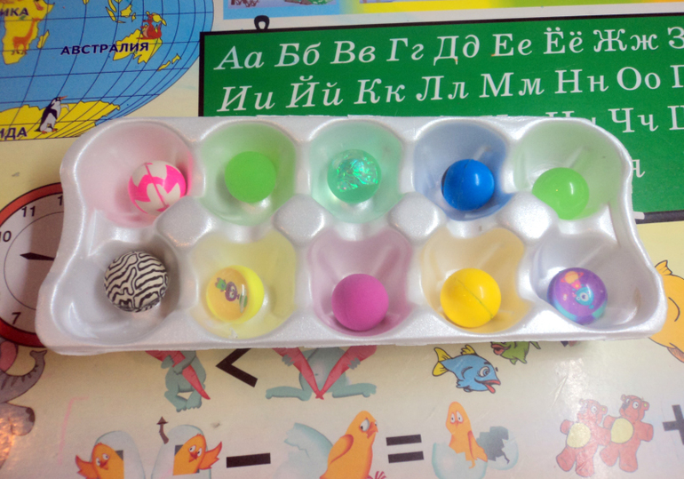 Ребенок смотрит на «сетку» 2-3 секунды, я вынимаю мячики, затем дочке необходимо разложить их так, как они были.