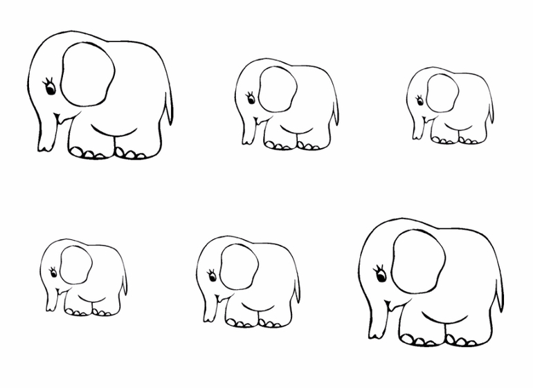-Вырезаем изображения цирковых слоников. Раскладываем их по росту.
