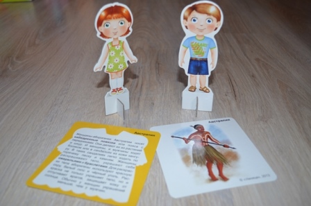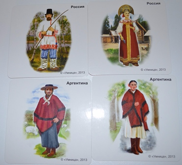 С каждым днем занятий по этому пособию я понимаю, что в данном наборе продумано много мелочей. Например, цвет на обороте карточек соответствует цвету страны на карте мира. Т.е. по сути, даже если ребенок забыл или вообще еще не знает, где расположена та или иная страна, он с легкостью может найти ее самостоятельно. А помогают в путешествии 2 героя Митя и Соня, которые как раз и примеряют на себя традиционные наряды разных стран.