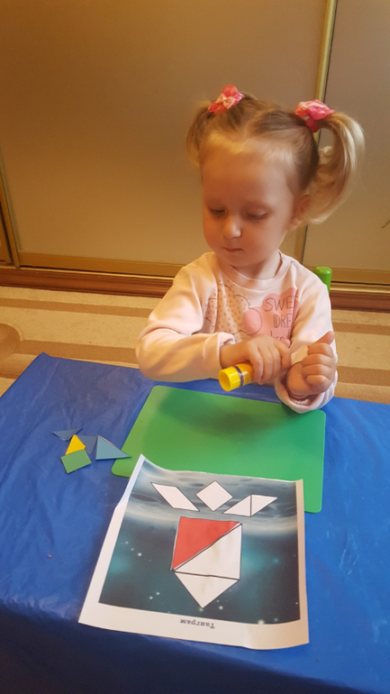 Повторяли геометрические фигуры, собирали танграм, который Полина просто обожает, а, если еще и клеить, то вообще!