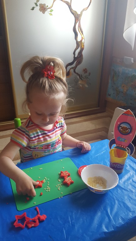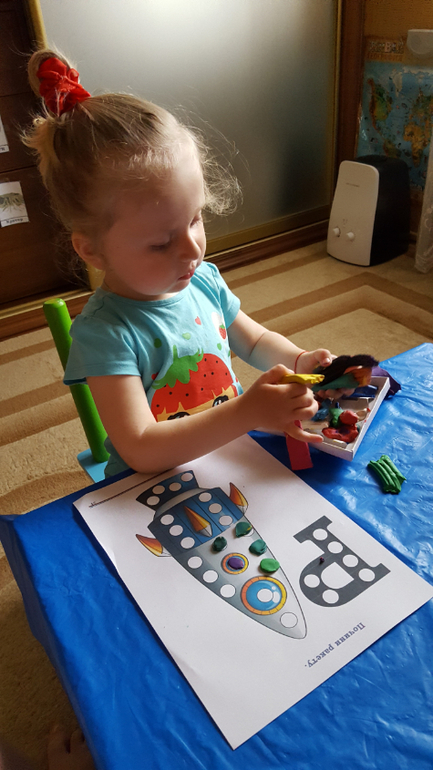 Помогали космонавту улететь на планету Земля, выкладывали бусинами ему путь. Ремонтировали ракету, делали заплатки из пластилина. Для песика в ракете делали звезды и украшали их макарончиками. Делали аппликации инопланетян.