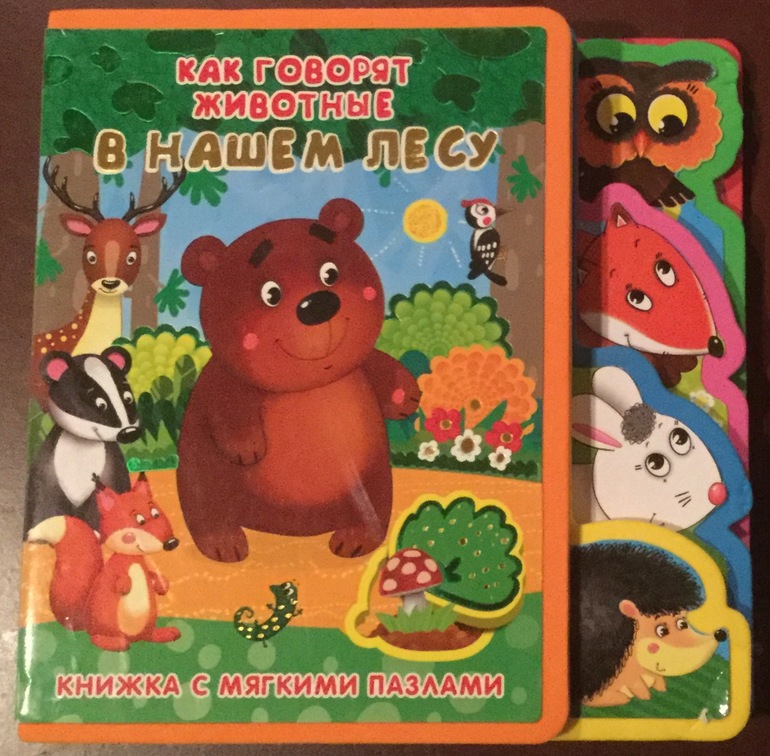 Более удачная книжка для маленького ребёнка. Сами пазлы уже более крупные и на них изображены животные. На каждом развороте только одно животное: на одной стороне взрослое животное, на другой - детёныш, а под самим пазлом - несколько детенышей.