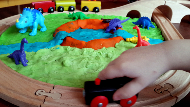 Вот, что мы соорудили с Максом сегодня, использую наше тесто. Небольшой парк Динозавров. Любимый сюжет и герои. Подобные игры развивают у детей фантазию, а также способствуют ролевым играм.