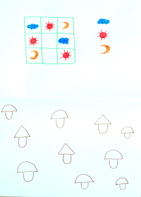 -И немножко математики. Ищем грибочки с треугольными шляпками, раскрашиваем красным, сравниваем, каких грибочков больше, каких меньше, сколько всего.