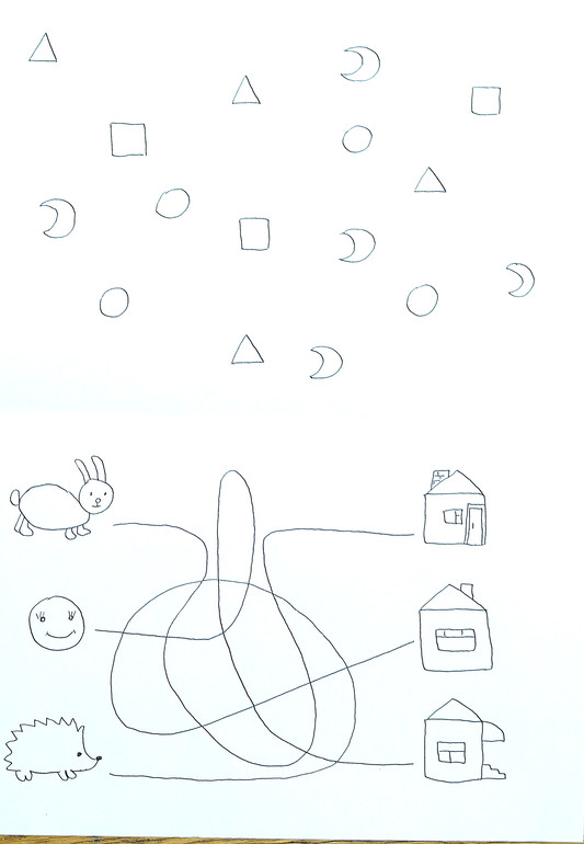 -Зверюшек провести в домики. Это на развитие внимания, но нарисовалось на одном листе, так и сфотографировала.