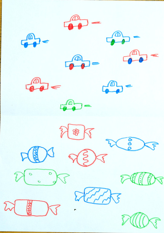Найти предмет по двум признакам, например синюю машинку с зелёными колёсами или круглую конфетку в зелёной обёртке.