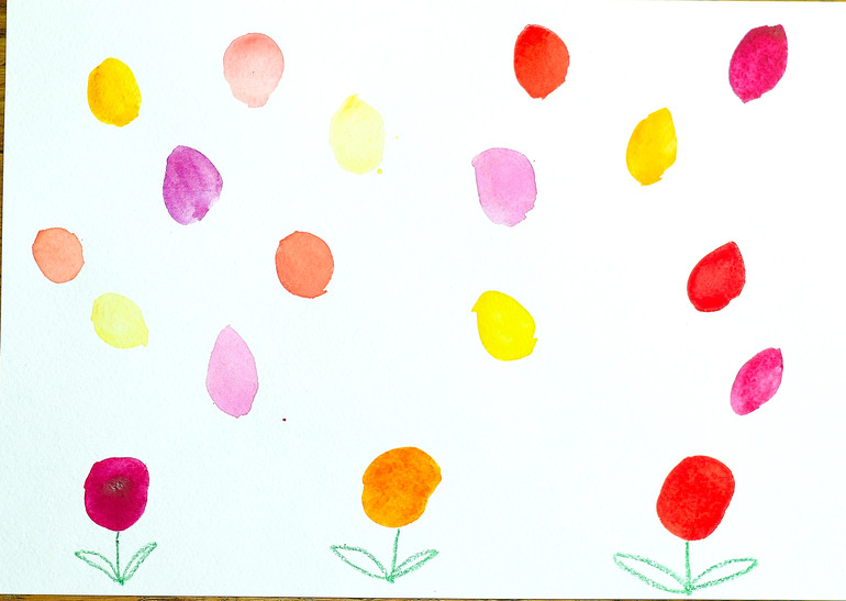 Ищем какие лепесточки облетели с цветочков внизу. Проводим карандашиком, заодно и моторика тренируется.
