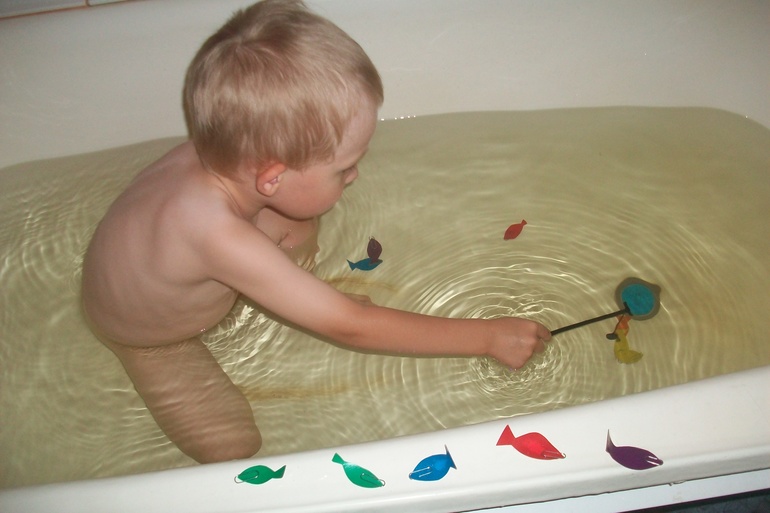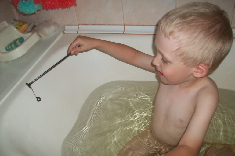 Ловили рыбок и выкладывали сушиться. Заодно провели опыт: рыбка без скрепки не тонет, т.к. легкая, а со скрепкой тонет, т.к. она железная и тянет вниз. Еще Максиму понравилось, что магнитная удочка примагничивается и к самой ванне.