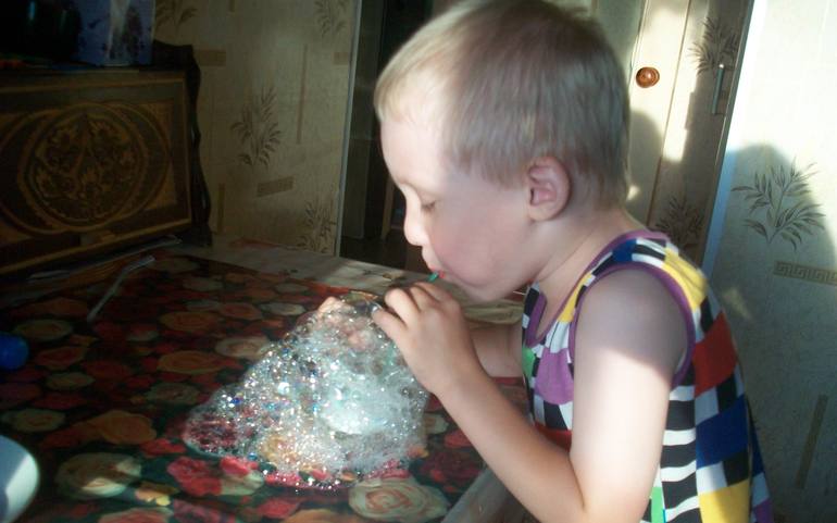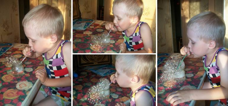 5. Мыльные пузыри. Увидела простой рецепт (3 ст.л. шампуня, 2 ч.л. сах.песка, 1 ст. воды) и решила опробовать на себе. Баночка, трубочка, ну вот собственно и всё. Дуем и удивляемся!